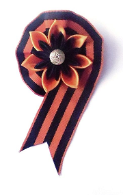 На 9 мая по традиции все носят на груди ленту "георгиевскую", или в сочетании с лентой "триколор".Даже бантик или петелька из такой ленты на булавке уже смотрятся празднично. Мастерицы делают броши в стиле "канзаши" из таких лент, используя бусины, атласные ленты.